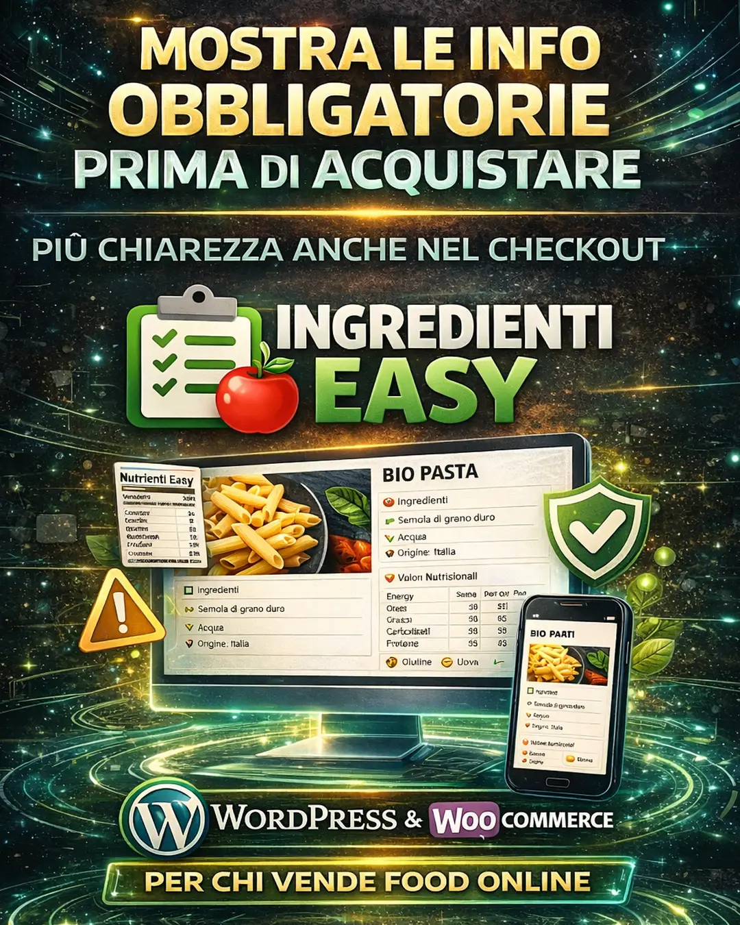 Ingredienti Easy è il plugin per WordPress + WooCommerce pensato per chi vende food online e vuole mostrare le informazioni obbligatorie nei punti chiave del percorso d’acquisto, incluso il  carrello e il checkout.